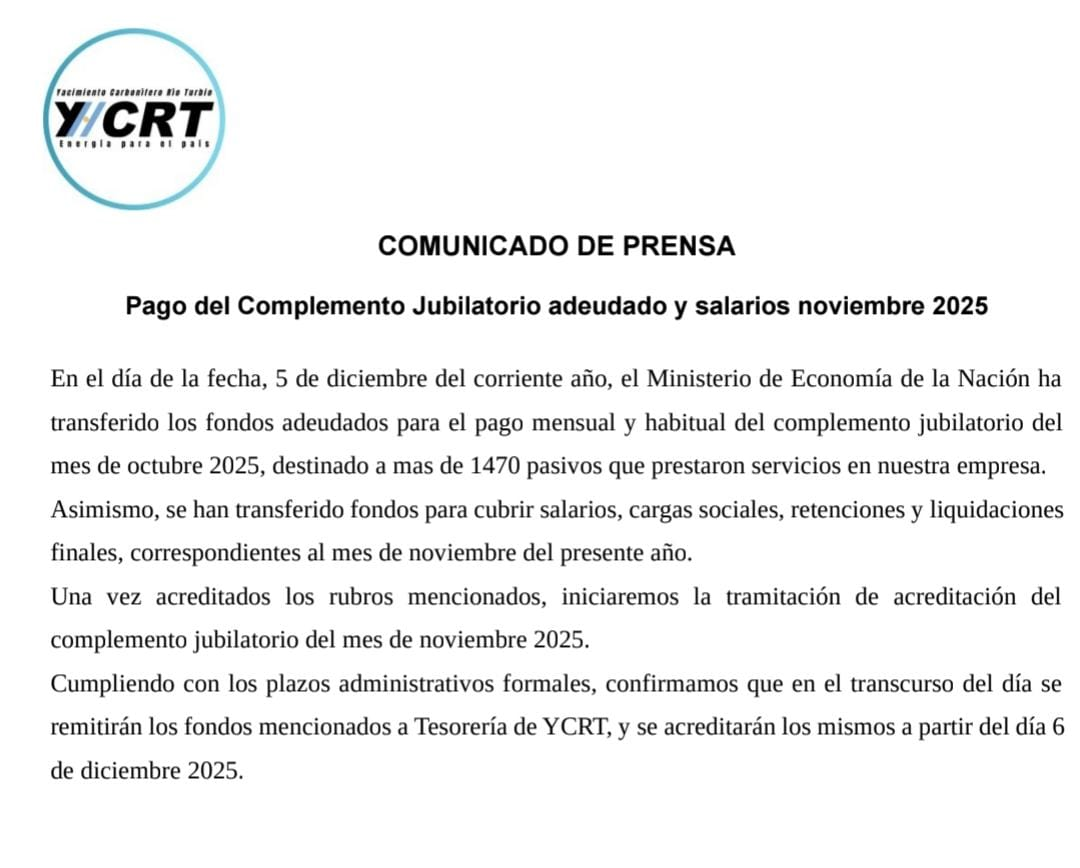 En el día de la fecha, 5 de diciembre del corriente año, el Ministerio de Economía de la Nación ha transferido los fondos adeudados para el pago mensual y habitual del complemento jubilatorio del mes de octubre 2025, destinado a mas de 1470 pasivos que prestaron servicios en nuestra empresa.