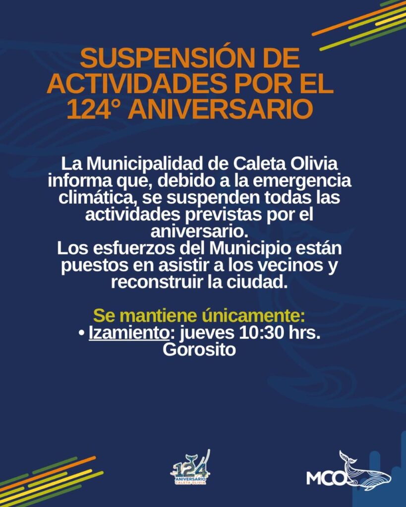 La Municipalidad de Caleta Olivia resolvió suspender todas las actividades por el 124° Aniversario de la ciudad, en un gesto que prioriza la emergencia climática y deja sin efecto cualquier celebración oficial prevista para estos días. Según informó el Ejecutivo, la decisión se tomó “ante la grave emergencia climática que afecta a nuestra ciudad y siguiendo las directivas del intendente Pablo Carrizo”, señalando que el foco está puesto exclusivamente en atender la situación crítica que dejó el temporal. El Municipio remarcó que “no es momento de celebraciones, sino de unidad, responsabilidad y trabajo”, en alusión al impacto que el fenómeno provocó sobre distintos barrios.