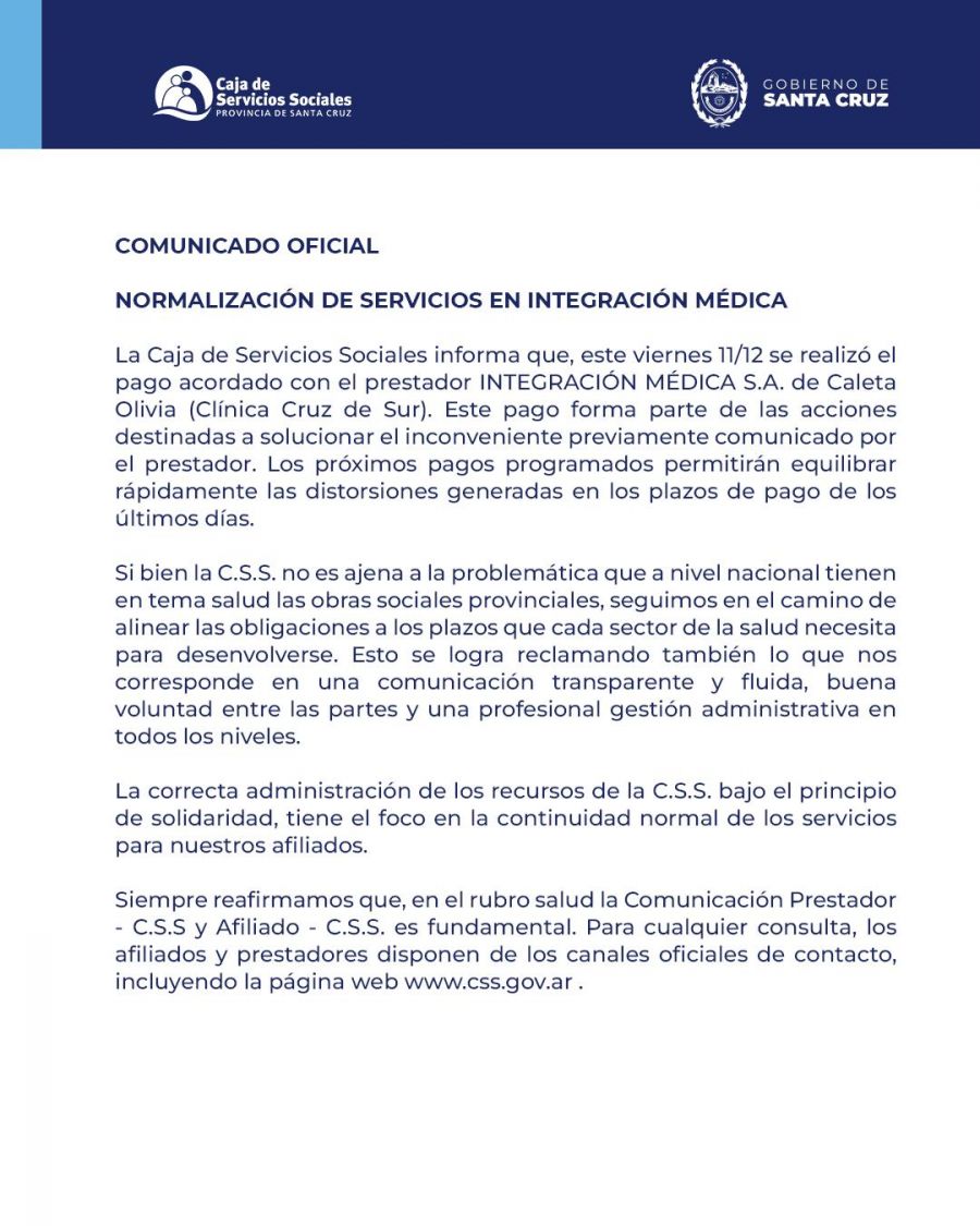 La Caja de Servicios Sociales informa que, este viernes 5/12, se realizó el pago acordado con el prestador INTEGRACIÓN MÉDICA S.A. de Caleta Olivia (Clínica Cruz de Sur). Este pago forma parte de las acciones destinadas a solucionar el inconveniente previamente comunicado por el prestador. Los próximos pagos programados permitirán equilibrar rápidamente las distorsiones generadas en los plazos de pago de los últimos días.